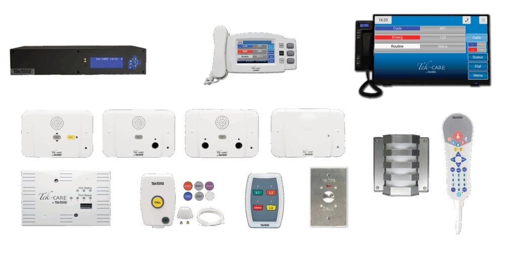 The Tek-CARE3000 is TekTone’s newest hard-wired nurse call system. This system is a supervised, microprocessor-based nurse call system offering two-way audio and visual communication. It supports staff-to-patient and staff-to-staff communication with flexible configuration tools. At its core is the Tek-CARE Hub, a GEN3 module that connects to Tek-CARE3000 stations and supports two master station options. These masters serve as control centers, displaying and prioritizing calls while managing system settings. The system includes a range of patient stations and devices, all built with modular components and simplified wiring for easy expansion in new or existing facilities.